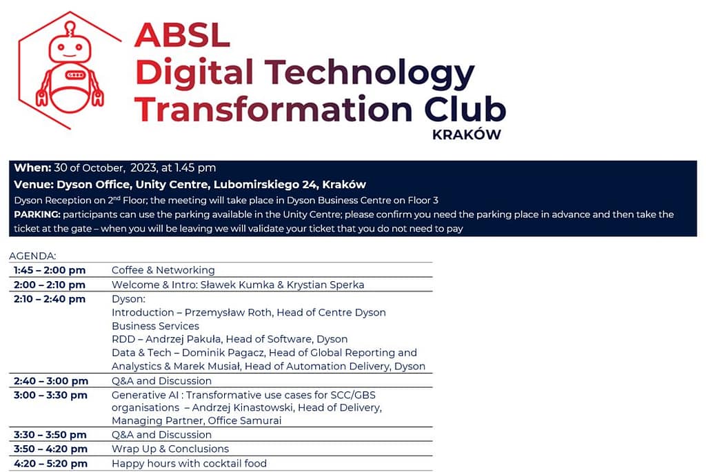 As a Krakow ABSL DTC Lead I had a pleasure to run the last in 2023 ABSL Digital Transformation Club (DTC) meeting in Krakow. Excellent and very timely topics!